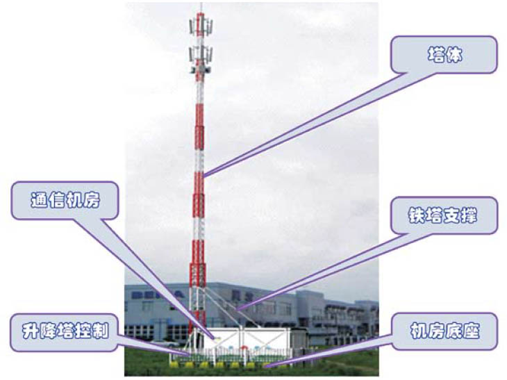 一體化基站主要組成:機(jī)房,塔體,鐵塔支撐,機(jī)房底座以及升降塔的控制等,具體如下圖: